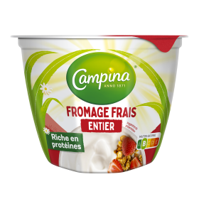 Commencez votre journée fort avec le Fromage Frais Campina ! Notre fromage frais entier est une variété de fromage frais, délicieusement onctueuse selon la recette du Brabant. C’est un produit 100 % naturel, sans conservateurs, et naturellement riche en protéines. Accompagnez-le de granola et des fruits de votre choix pour un délicieux petit-déjeuner. Conserver au frais à max. 7 °C.Disponible dans un emballage individuel et pratique de 180g ou un pot refermable de 500g.